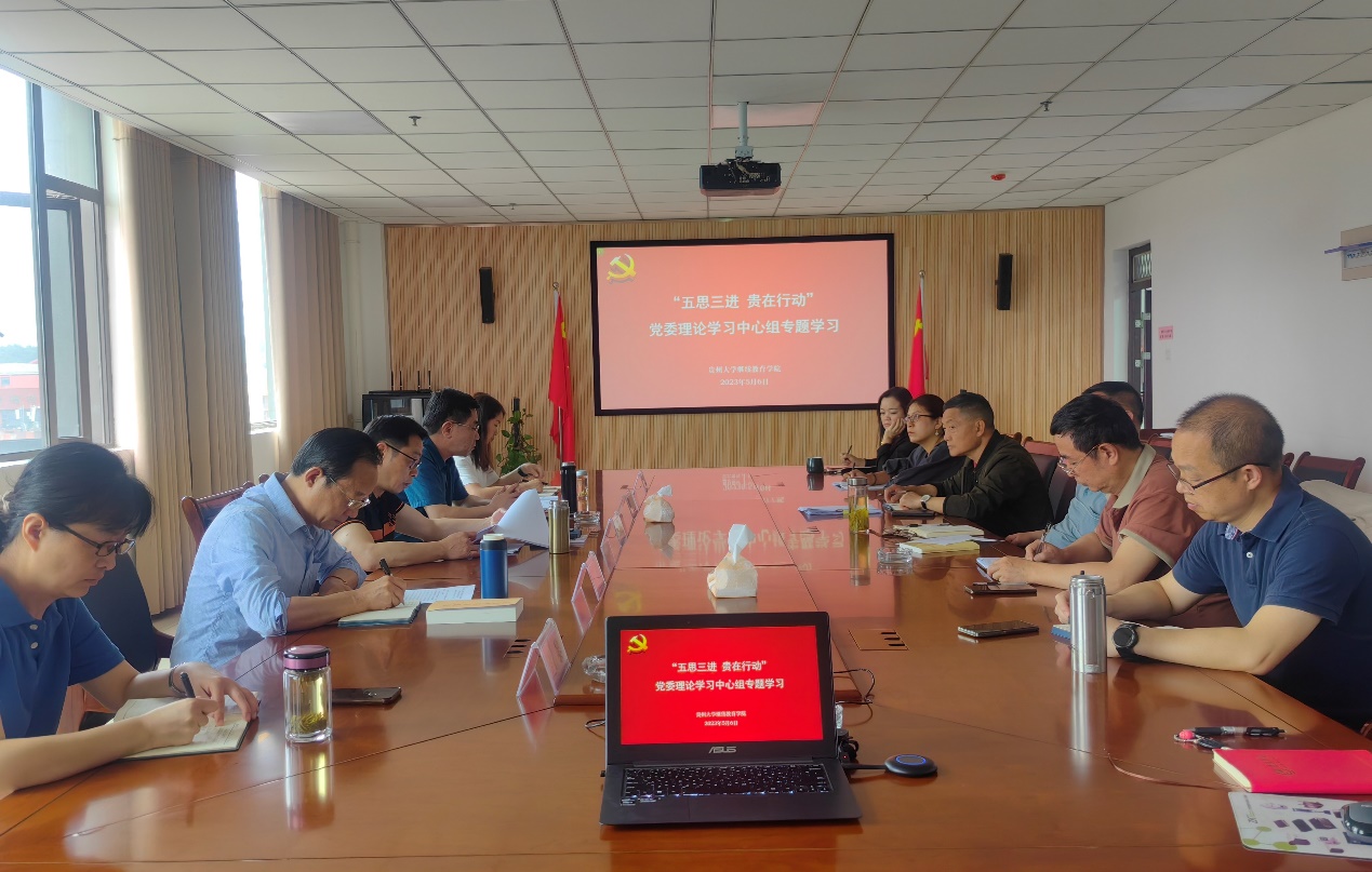 5月6日,学院党委班子学习贯彻习近平新时代中国特色社会主义思想主题教育“五思三进 贵在行动”专题学习研讨暨理论学习中心组第2次集体学习(扩大)会议在610会议室召开,院党委领导班子成员、正处级干部出席会议,党支部书记、职能部门党员负责人列席会议,会议由党委书记白林立主持。会议以“五思三进 贵在行动”为主题开展学习研讨。
